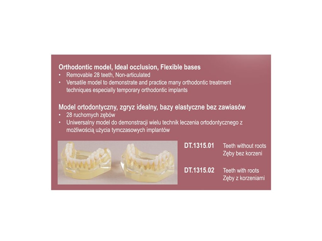 Real Series ortodontický model třídy I s elastickou bází nabízí realistickou simulaci správného postavení zubů s možností pohybu jednotlivých zubů. Model bez kořenů je navržen pro snadnou manipulaci při výuce, plánování ortodontické léčby a demonstracích pro pacienty či studenty. Elastická báze umožňuje flexibilní modelování a detailní zobrazení vztahů mezi horní a dolní čelistí, což podporuje efektivní porozumění ortodontickým principům a technikám. Model je vhodný pro školy, kliniky i soukromé instruktory, kteří chtějí vizuálně ukázat pohyblivost zubů a správný skus.