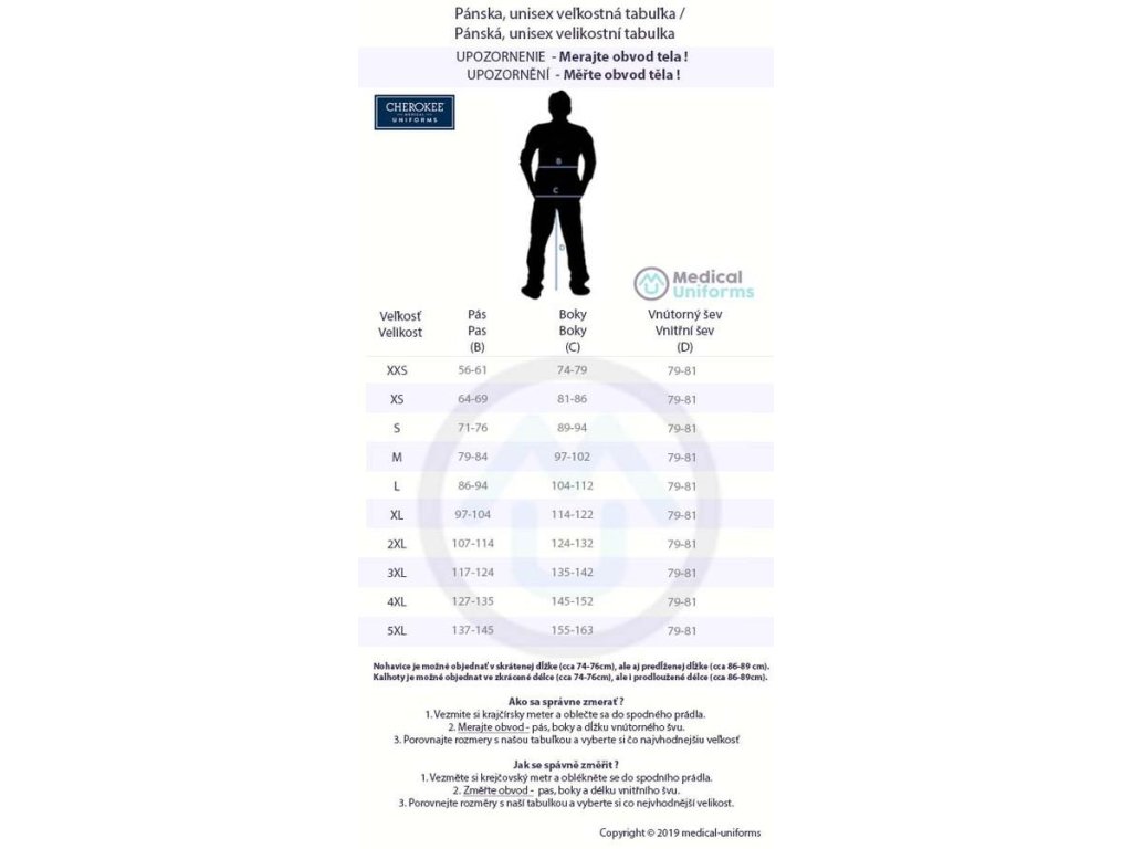 Střih kalhot je unisex a rovný, což znamená, že se hodí pro širokou škálu postav. K dispozici je široký výběr velikostí, od XXS až po 5XL, takže si každý najde tu svou ideální velikost. Prodloužená délka je k dispozici ve velikostech XS – 2XL, zkrácená délka ve velikostech XXS – 2XL. Tyto kalhoty skvěle padnou jak zdravotním sestrám, lékařům, zubařům, veterinářům, tak i dalším profesím, jako jsou fyzioterapeuti nebo maséři.