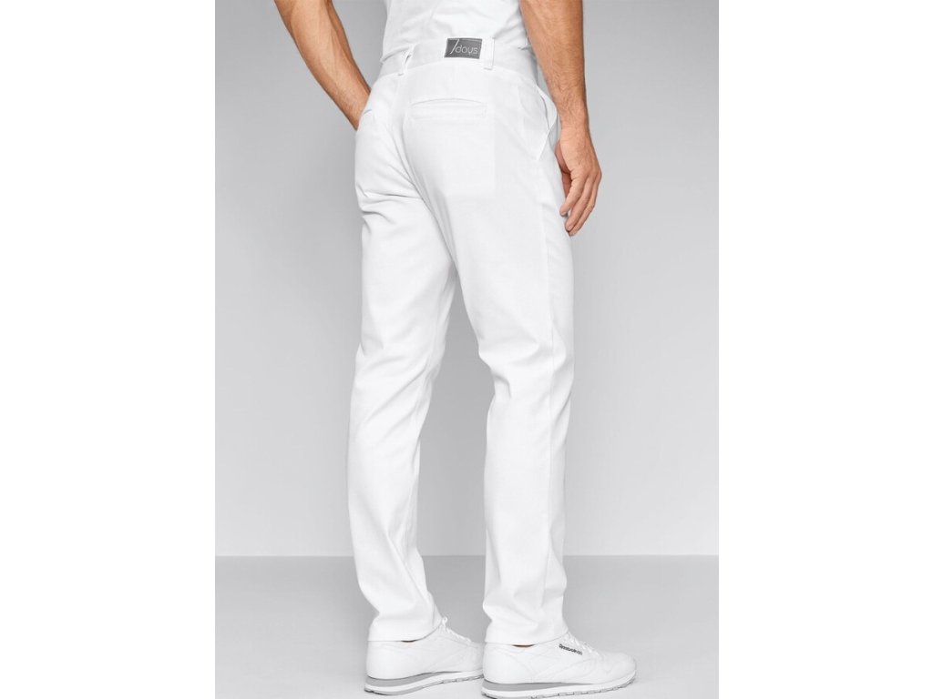 Dodání 4-5 pracovních dnů. Bílé pánské zdravotnické kalhoty v chino stylu. Příjemné a padnoucí kalhoty mají zapínání na knoflík, dvě přední a dvě zadní kapsy, poutka na pásek. Oceníte kvalitní NEPRŮHLEDNÝ materiál, který se nemačká a snadno se žehlí. Rovné nohavice dodají slušivý střih. U kotníků se lehce zužují, lze je ohrnout.