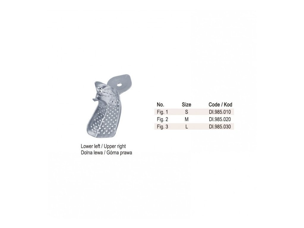 Tato perforovaná hliníková otiskovací lžička slouží k sejmutí částečných otisků v oblasti horní pravé nebo dolní levé kvadranty. Je ideální pro práce vyžadující lokální otisky – např. při výrobě korunek, můstků, inlayí či fazet. Perforovaný povrch umožňuje pevné ukotvení otiskového materiálu, zatímco lehká a tuhá hliníková konstrukce zajišťuje stabilitu i po opakovaném použití.