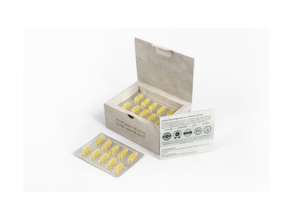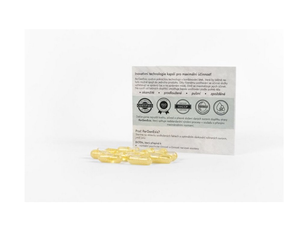 Re-GenEsis - 60 kapslí využívá průlomovou mikrokapslovou technologii, která umožňuje kombinaci jinak neslučitelných látek a zajišťuje jejich biologickou dostupnost. Díky vícefázovému uvolňování se aktivní složky vstřebávají přesně tehdy a tam, kdy a kde je tělo nejvíce potřebuje – okamžitě, pulzně, s prodlouženým účinkem nebo se zpožděním. Pokročilý systém chrání stabilitu a bioaktivitu klíčových nutrientů, jako jsou Omega-3, D3, K2, biotin a kyselina listová, a umožňuje tak jejich optimální využití v organismu.