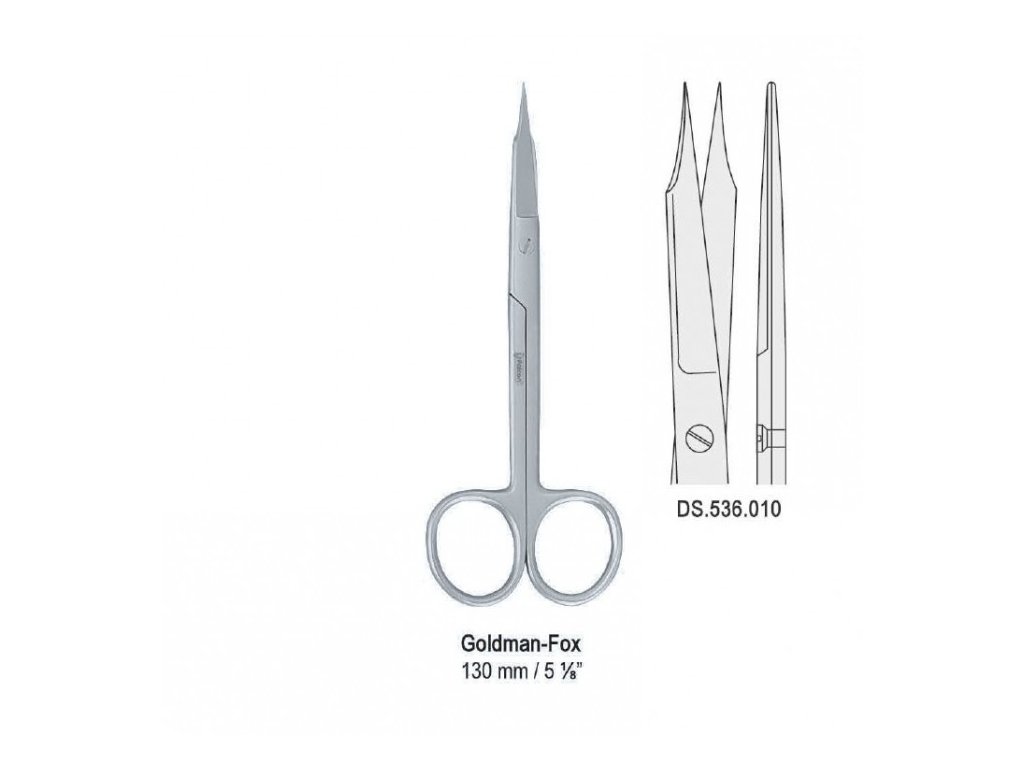 Chirurgické nůžky typu Goldman-Fox v rovném provedení o délce 130 mm jsou standardem v oblasti stomatologie, parodontologie a drobné chirurgie. Ostré čelisti s jemným zakončením zajišťují čistý řez bez mačkání tkáně, a to i ve ztížených podmínkách.