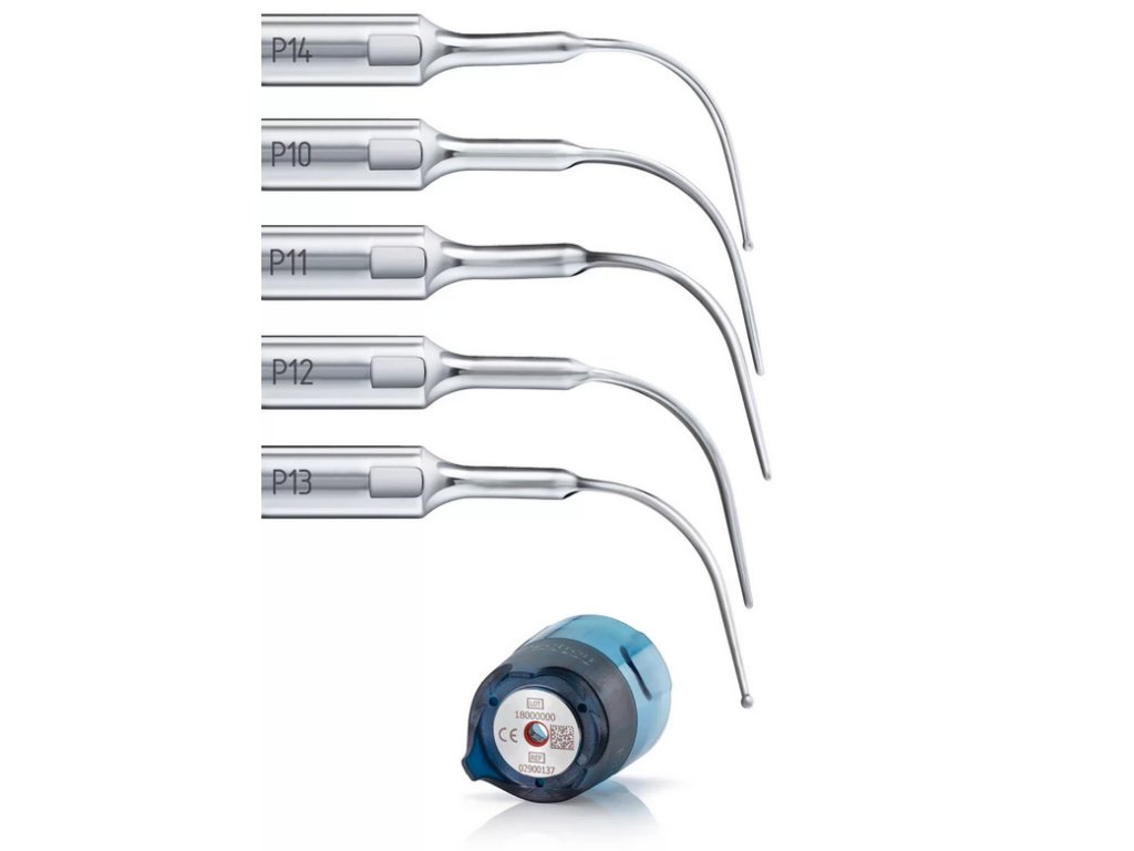 Perio Maintenance set – sada koncovek určená pro šetrné čištění parodontu, zejména k odstraňování konkrementů a biofilmu z konkavit a hlubokých parodontálních kapes. Obsahuje vložky P10–P14 a 5 momentových klíčů K10 pro přesné uchycení.