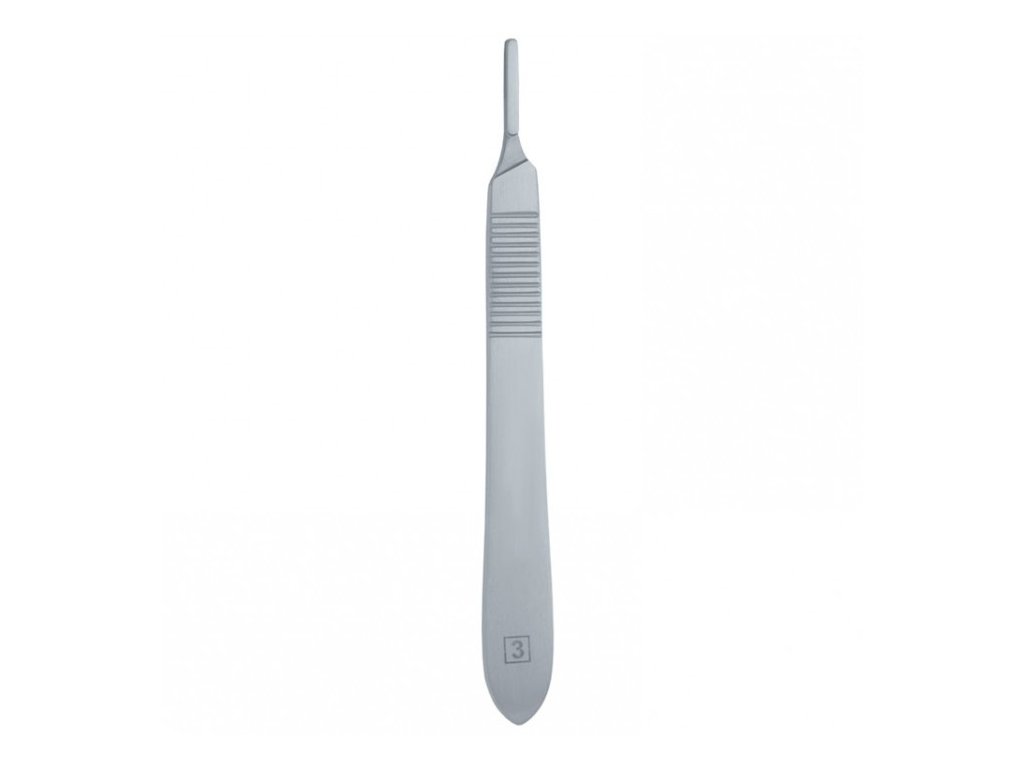 Rukojeť fig. 3 je klasickým chirurgickým nástrojem, nezbytným při každé přesné incizi. Její štíhlé provedení s jemným vroubkováním zajišťuje bezpečný úchop i při práci s rukavicemi. Ideální volba pro každodenní použití v ordinacích i operačních sálech.