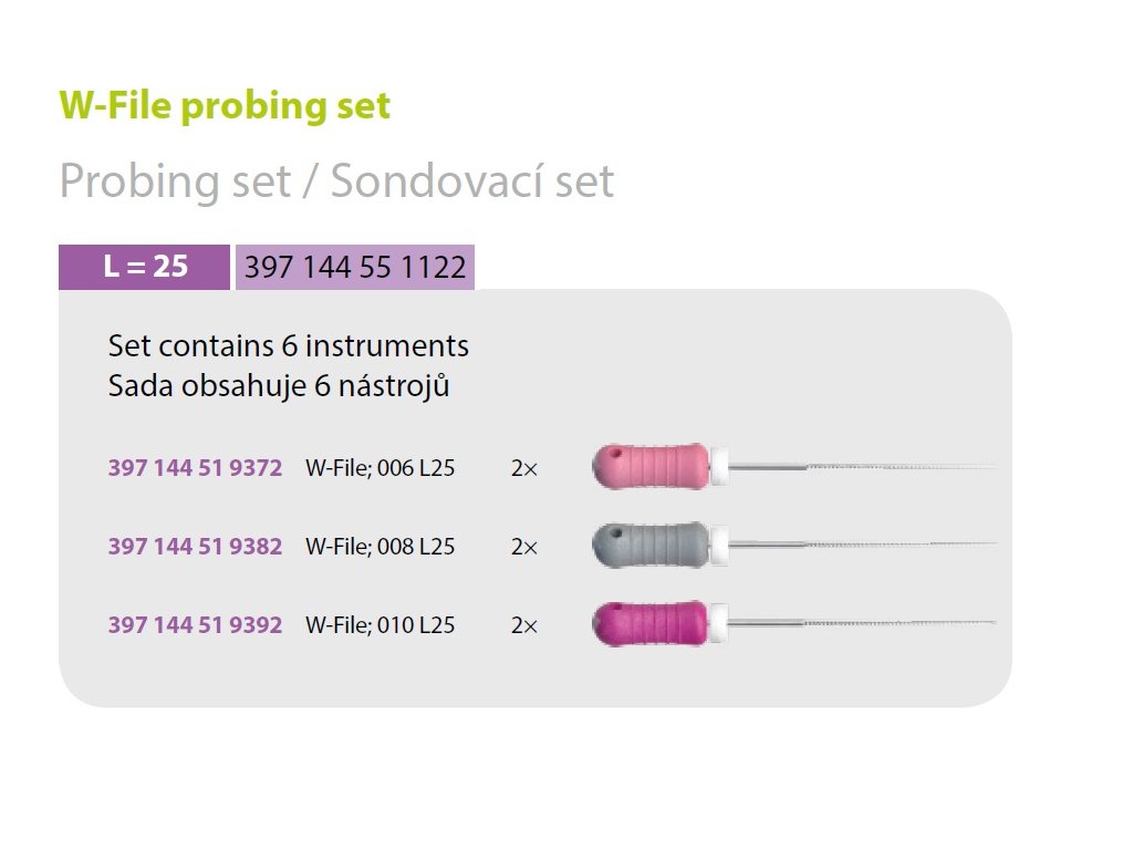 W-File Sondovací set L25 je speciálně navržená sada nástrojů pro sondování a měření kořenových kanálků. Tento set je klíčový pro přesnou diagnostiku a přípravu kanálků před dalšími endodontickými procedurami.