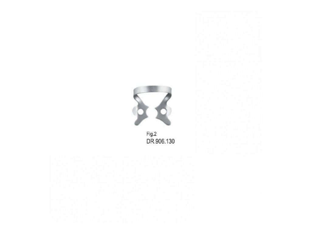 Svorka na kofferdam fig. 2 je speciálně určena pro fixaci blány okolo premolárních zubů. Tvar a síla přítlaku jsou navrženy tak, aby zajistily bezpečné uchycení bez poškození tkání.