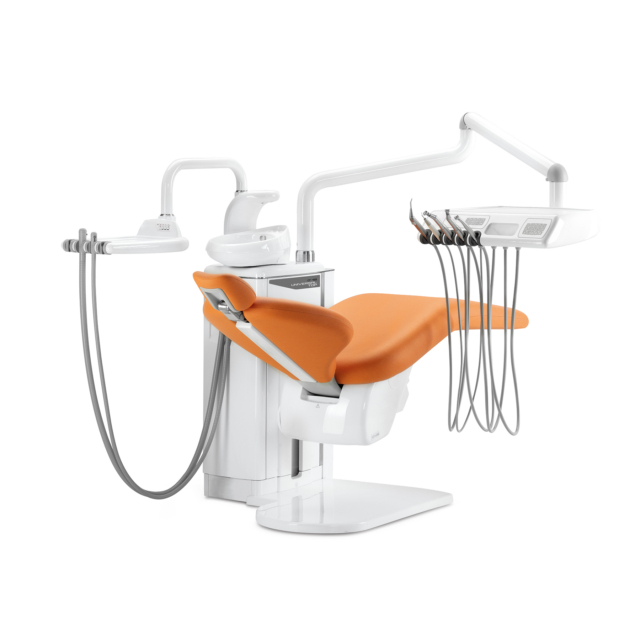 Universal Top s podlahovým plivátkem a závěsnými hadicemi je moderní stomatologická jednotka kombinující funkčnost, spolehlivost a ergonomii. Konstrukce zahrnuje podlahový cuspidorový sloup a konzolové křeslo otočné až o 20°, které zajišťuje pohodlný přístup k pacientovi ze všech stran.