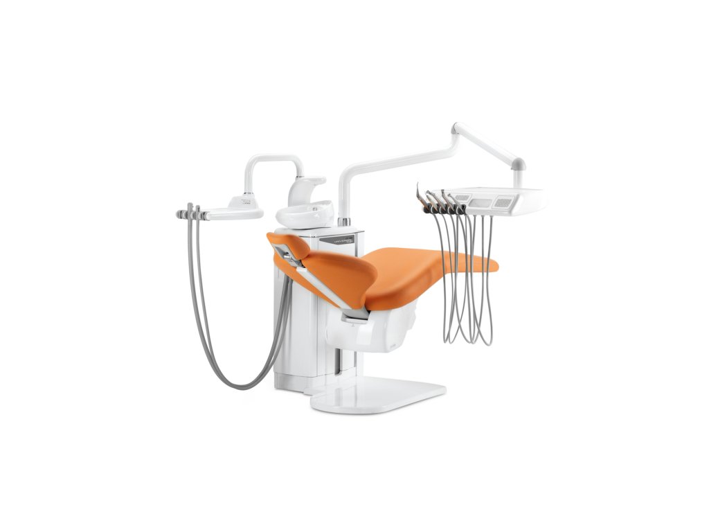 Stomatologická jednotka Universal Top s podlahovým plivátkem a závěsnými hadicemi kombinuje konzolové křeslo otočné o 20° s praktickým systémem závěsných hadic, které usnadňují manipulaci a snižují opotřebení. Lékařská konzola pojme až pět přístrojů, asistenční až tři sací hadice a volné pouzdro na pantografickém rameni.