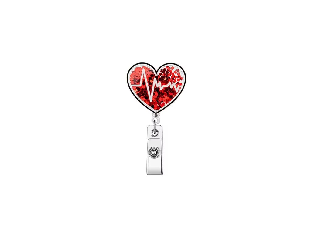 Stylová visačka na jmenovku ve tvaru srdce s motivem EKG a pohyblivými červenými třpytkami dodá vašemu outfitu jedinečný vzhled. Ideální pro zdravotníky, lékaře a sestry jako praktický a elegantní doplněk.