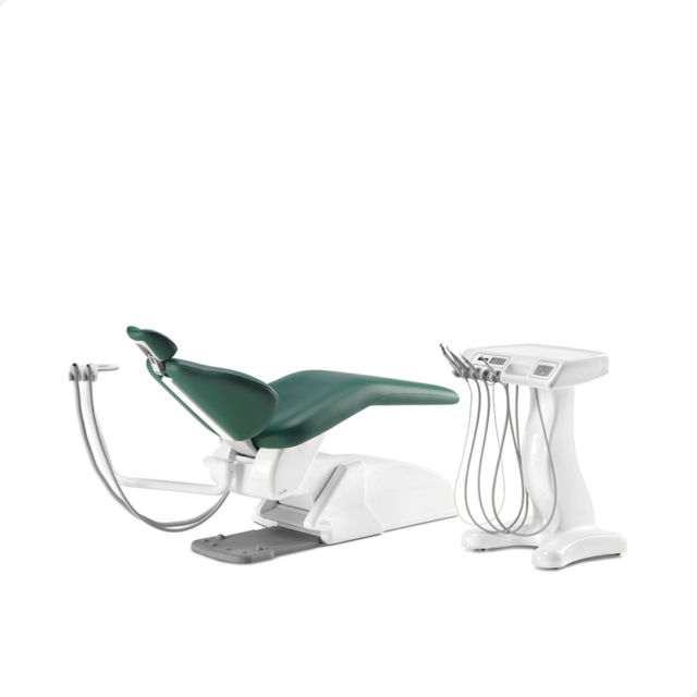 Stomatologická jednotka Punto s křeslem Moon kombinuje pevné podlahové křeslo s mobilním vozíkem vybaveným pětipřístrojovou konzolí se závěsnými hadicemi. Nabízí volnost pohybu, snadné přemisťování a ergonomické uspořádání pro práci lékaře i asistenta. Membránová klávesnice s displejem umožňuje ovládání nástrojů i polohování křesla, zatímco keramická vanička a odsávací rameno zvyšují komfort při ošetření.