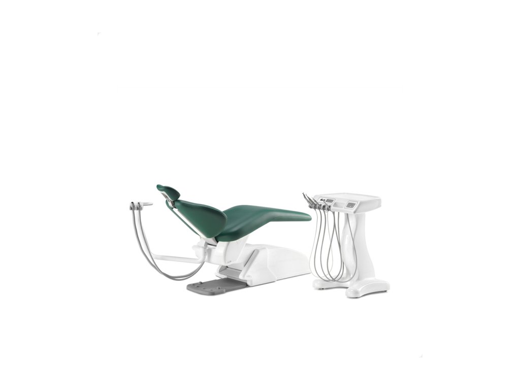 Stomatologická jednotka Punto s křeslem Moon kombinuje pevné podlahové křeslo s mobilním vozíkem vybaveným pětipřístrojovou konzolí se závěsnými hadicemi. Nabízí volnost pohybu, snadné přemisťování a ergonomické uspořádání pro práci lékaře i asistenta. Membránová klávesnice s displejem umožňuje ovládání nástrojů i polohování křesla, zatímco keramická vanička a odsávací rameno zvyšují komfort při ošetření.