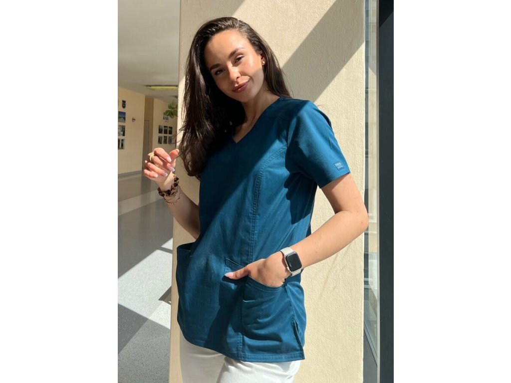 Tato halena je příkladem vyváženosti mezi pohodlím, stylem a funkčností, což ji činí oblíbenou volbou pro všechny, kdo hledají kvalitní pracovní oblečení ve zdravotnickém prostředí.