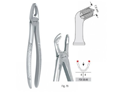 Kleště fig. 79 evropského typu jsou navrženy speciálně pro extrakci dolních zubů moudrosti (třetích molárů). Jejich tvar je uzpůsoben pro efektivní přístup k retinovaným nebo šikmo postaveným osmičkám. Robustní konstrukce a přesně profilované...