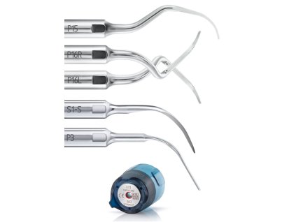 Perio Maintenance set – sada koncovek určená pro šetrné čištění parodontu, zejména k odstraňování konkrementů a biofilmu z konkavit a hlubokých parodontálních kapes. Obsahuje vložky P10–P14 a 5 momentových klíčů K10 pro přesné uchycení.